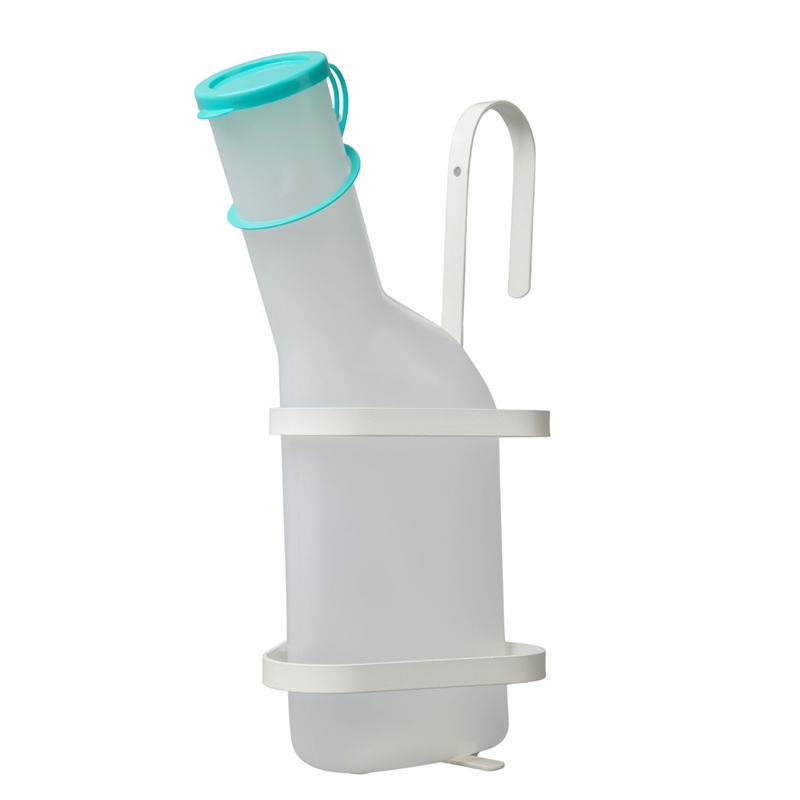 Dank der weißen Kunststoffbeschichtung ist der Halter nicht nur korrosionsgeschützt und pflegeleicht, sondern auch optisch dezent und hygienisch. Die einfache Fixierung der Urinflasche in der gewünschten Position erhöht die Sicherheit für Patient und Pflegepersonal gleichermaßen.